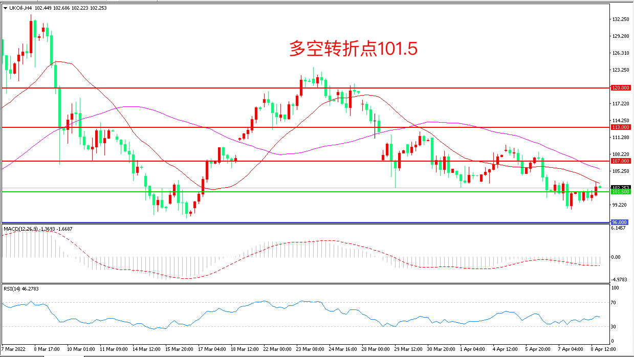 4小时图看,油价围绕101.5美元附近窄幅震荡,横盘迹象明显,均线系统呈空头排列,MACD绿柱增加,RSI指标走平,日内延续震荡概率较大。