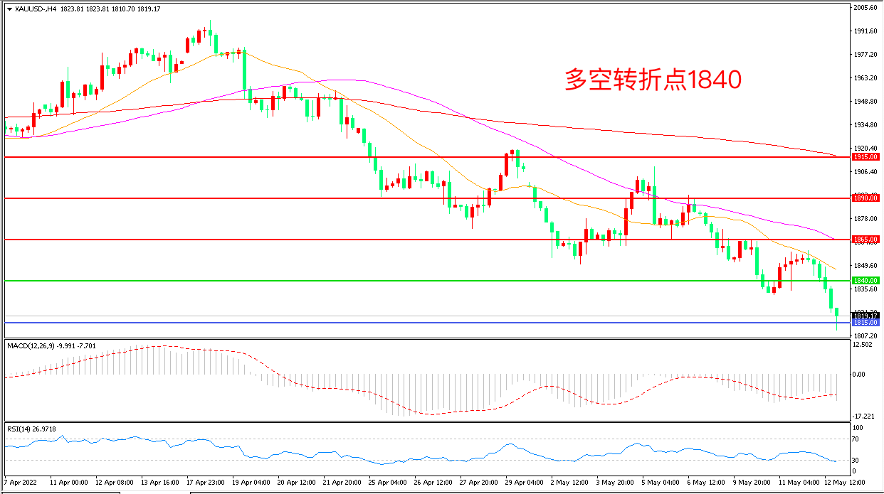 周四(5月12日),鲍威尔表示,美联储拥有降低快速通胀的工具和决心,但未来2次会议上各加息50个基点是合理的,美元指数跳涨,现货黄金再度暴跌,收报1819.85美元/盎司。美联储目前可能面临的局面是,以经济衰退为代价来控制物价,连续的加息会对流动性造成明显影响,金价延续下行概率较大。