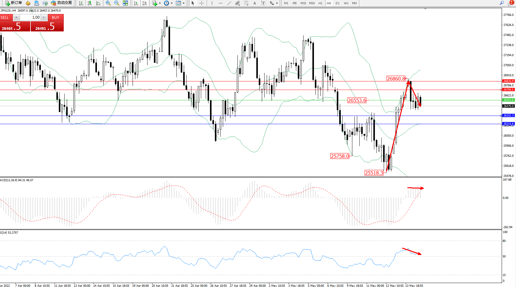 技术点评:低位多头动力强势拉升上扬,延续布林带指标上轨上移至26860附近节点后遇阻回撤,空头动力短期高位入场下行,布林带指标呈张口走势持续中,MACD指标处于0轴线上方多头区域维持整理平移,RSI指标处于50均衡线上側窄幅整理平移中;