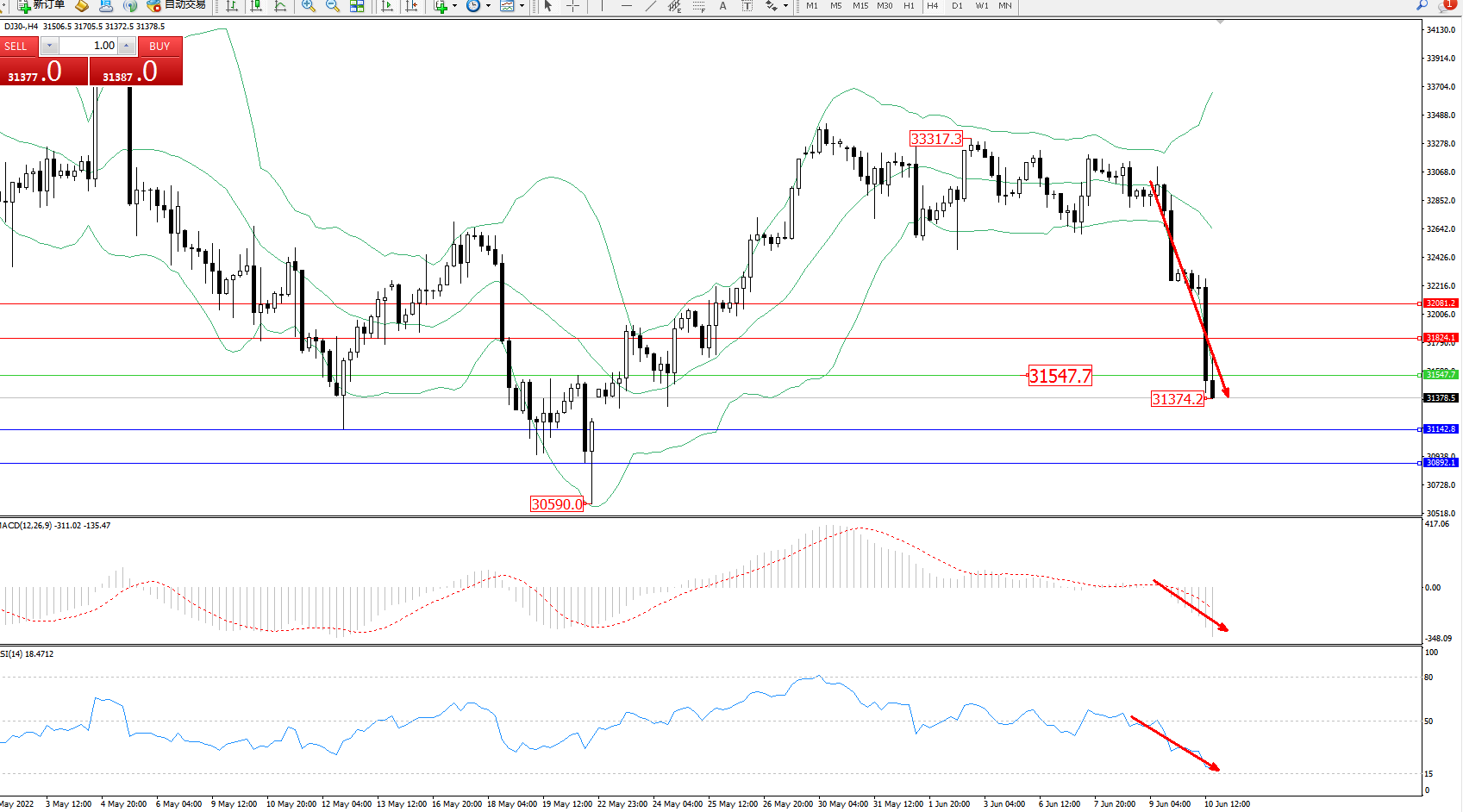 道琼斯指数DJ30——4小时K线图显示: