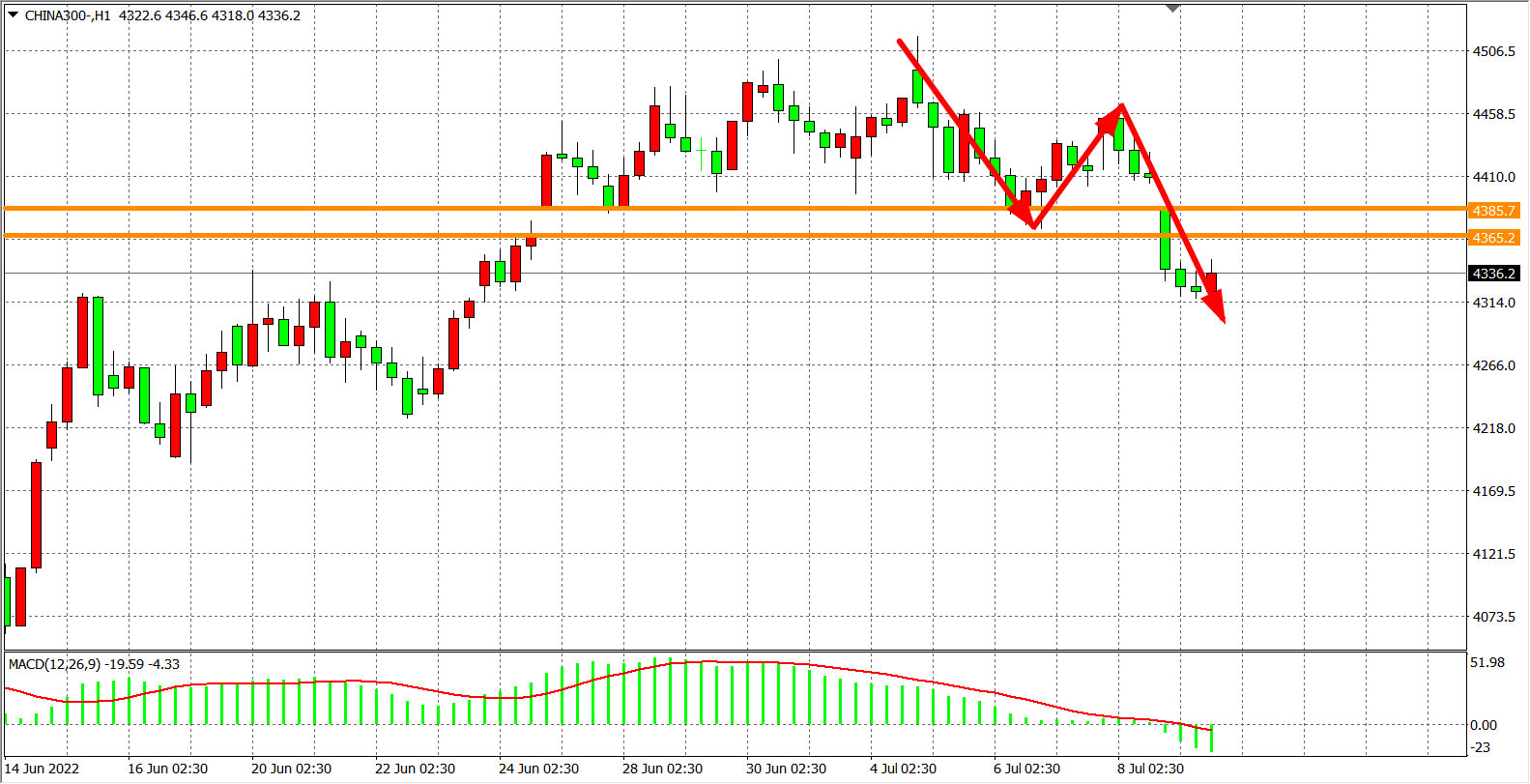 1小时图看,沪深300回落直接下破4385以及4365两个关键支撑点,短线趋势开始转为弱势,同时MACD在零轴之下放量,预示当前行情空头较强。前期阻力已转为为支撑,日内在4365之下看跌,目标4280-4200
