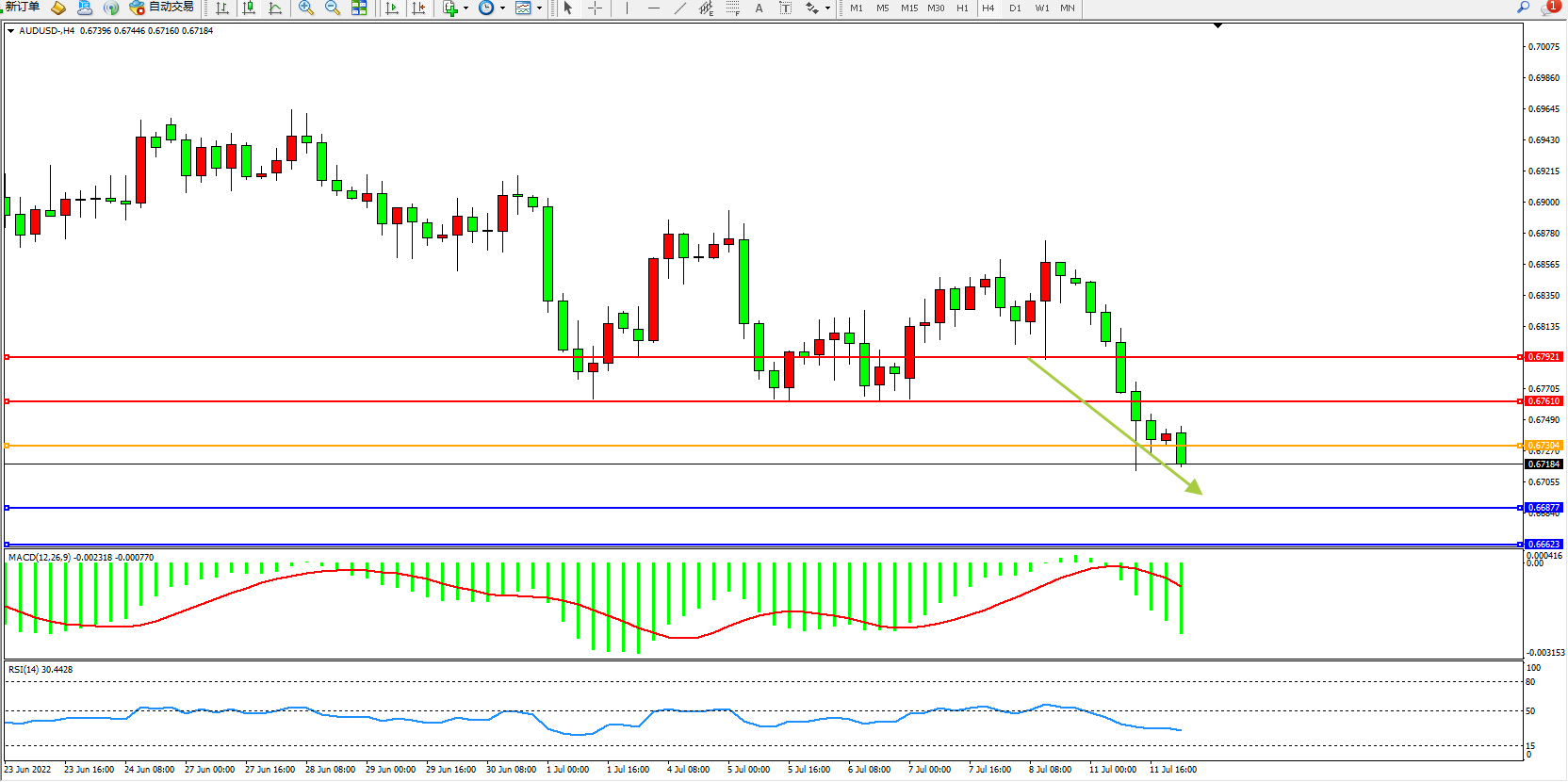 交易策略:0.67304下方看跌,目标0.66877、0.66623