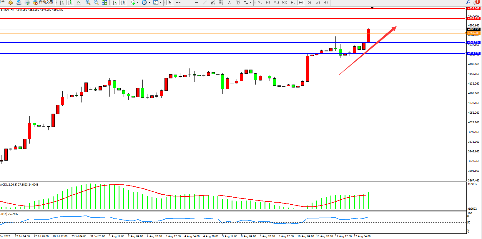 标普SP500——4小时K线图显示:
