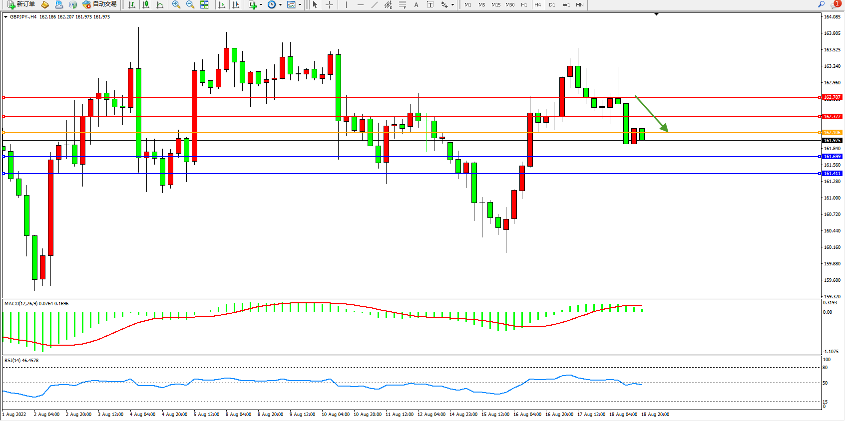 4小时图看:高位空头动力维持弱势震荡下行,短期空头动力有伺机入场迹象,MACD指标处于0轴线上側徘徊,RSI指标处于50均衡线附近弱势整理;