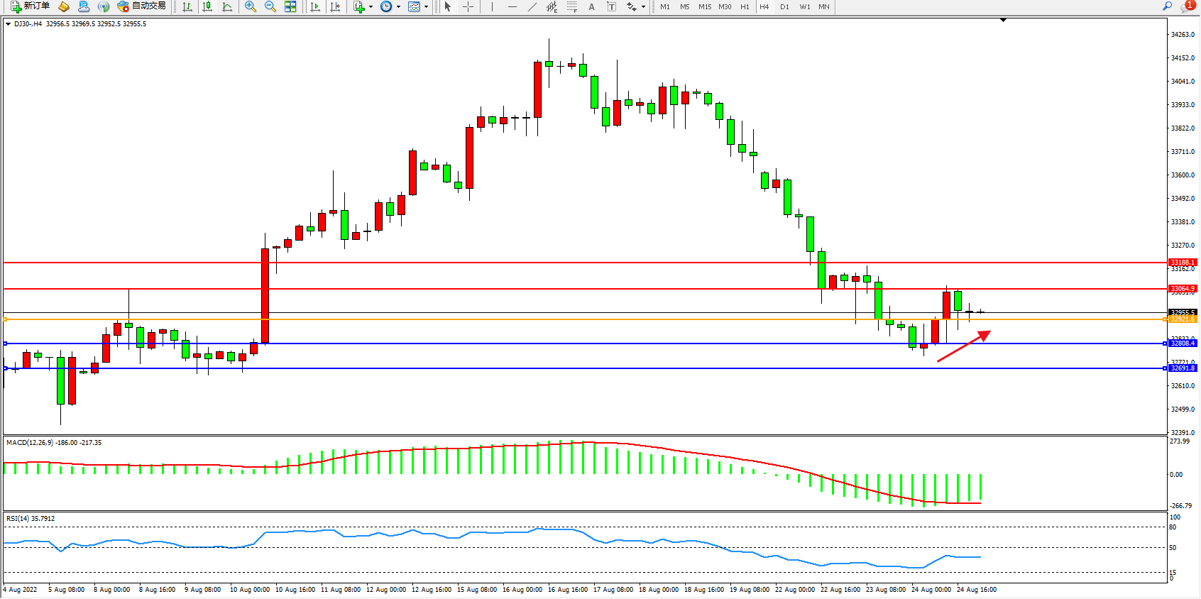 道琼斯指数DJ30——4小时K线图显示: