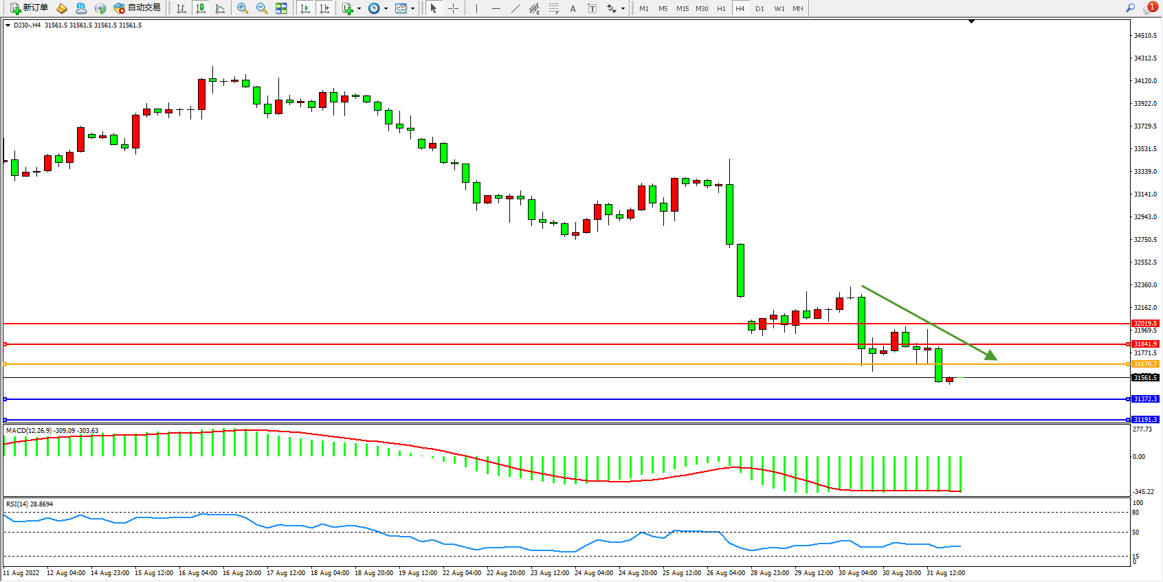 道琼斯指数DJ30——4小时K线图显示: