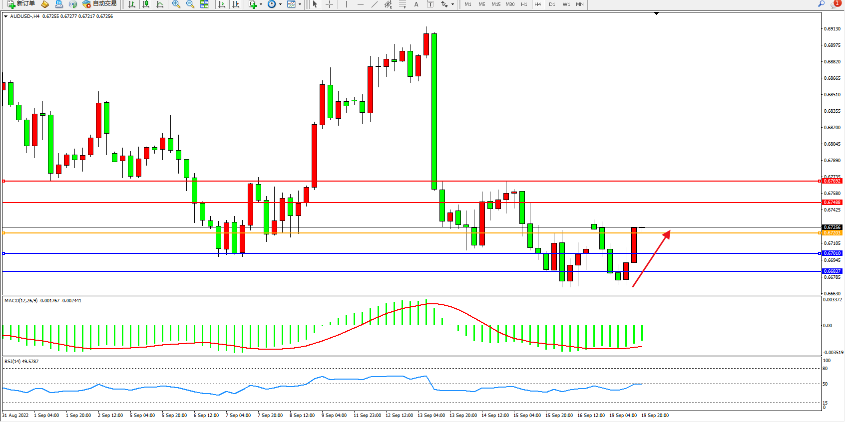 澳元美元AUDUSD——4小时K线图显示: