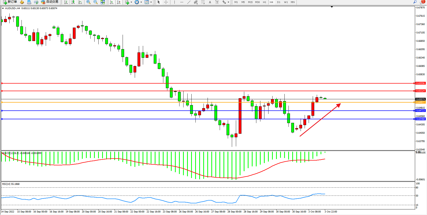 交易策略:0.64977上方看涨,目标0.65324、0.65556