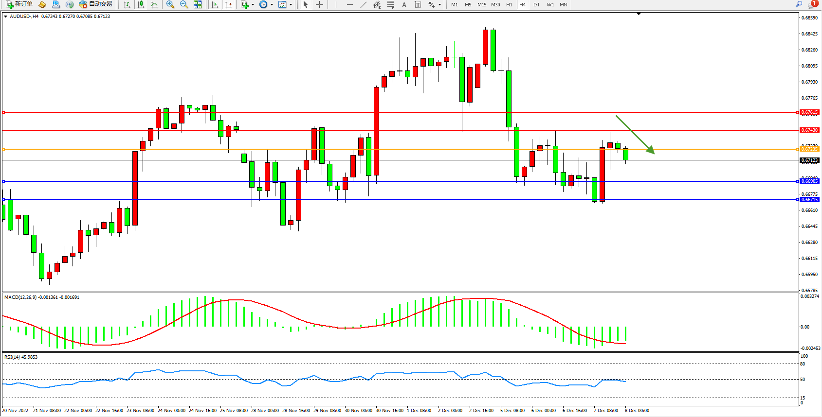 交易策略:0.67235下方看跌,目标0.66905、0.66715