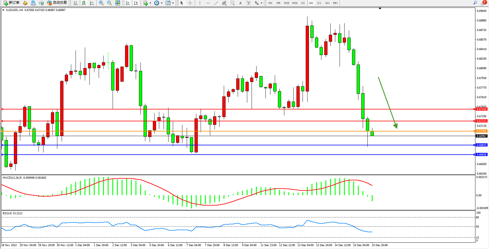 澳元美元AUDUSD——4小时K线图显示: