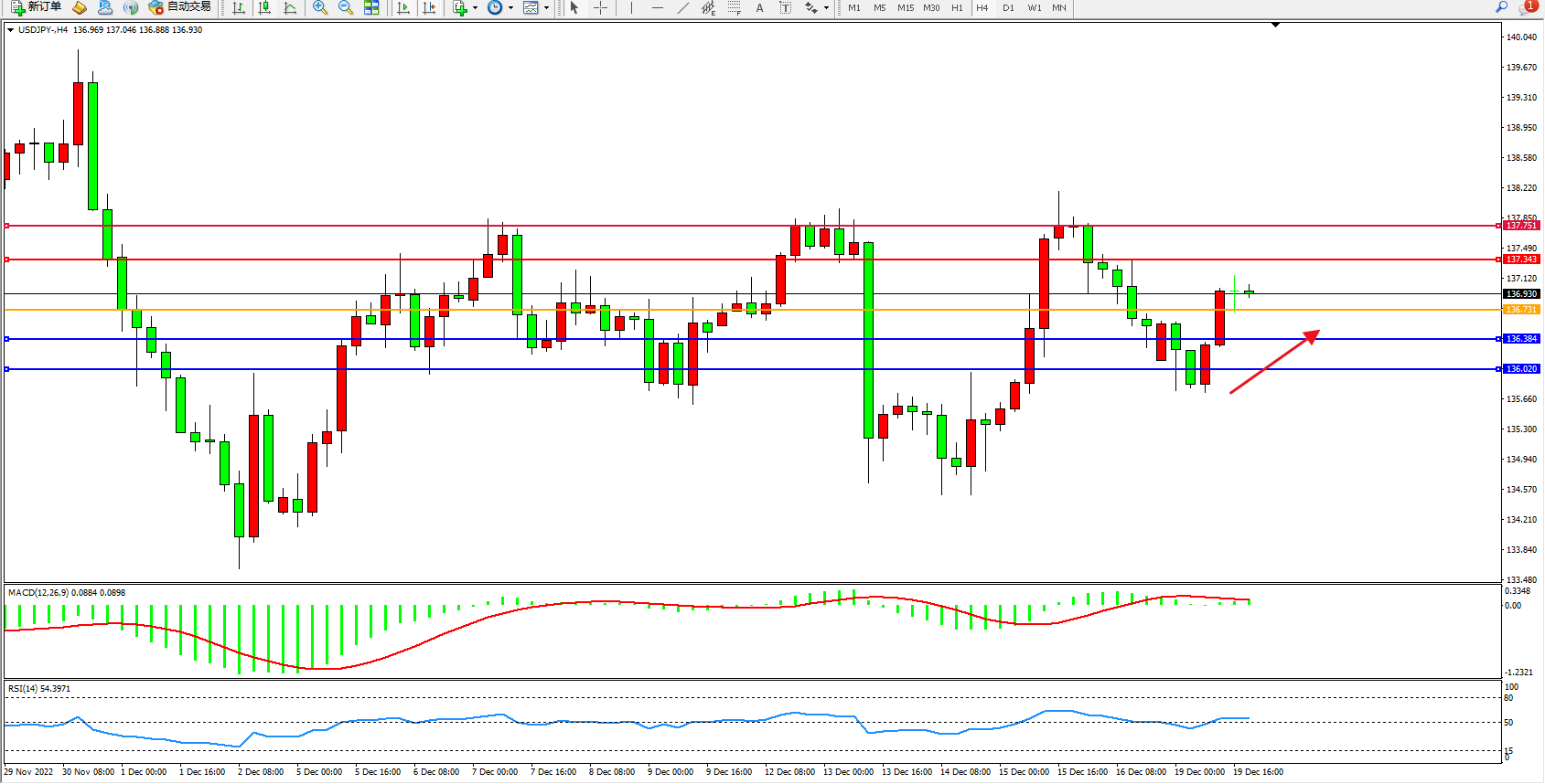 交易策略:136.731上方看涨,目标137.343、137.751