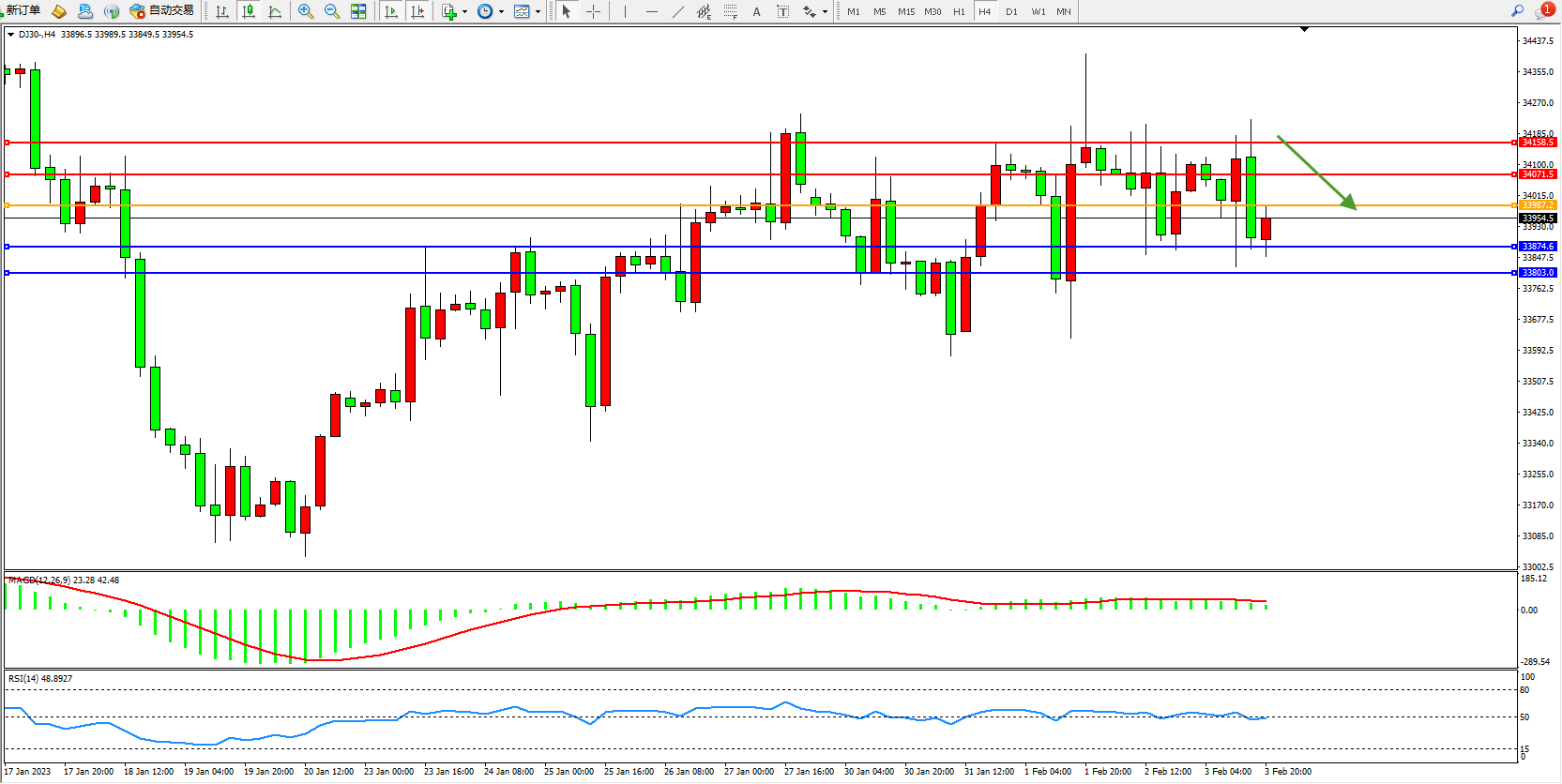 道琼斯指数DJ30——4小时K线图显示: