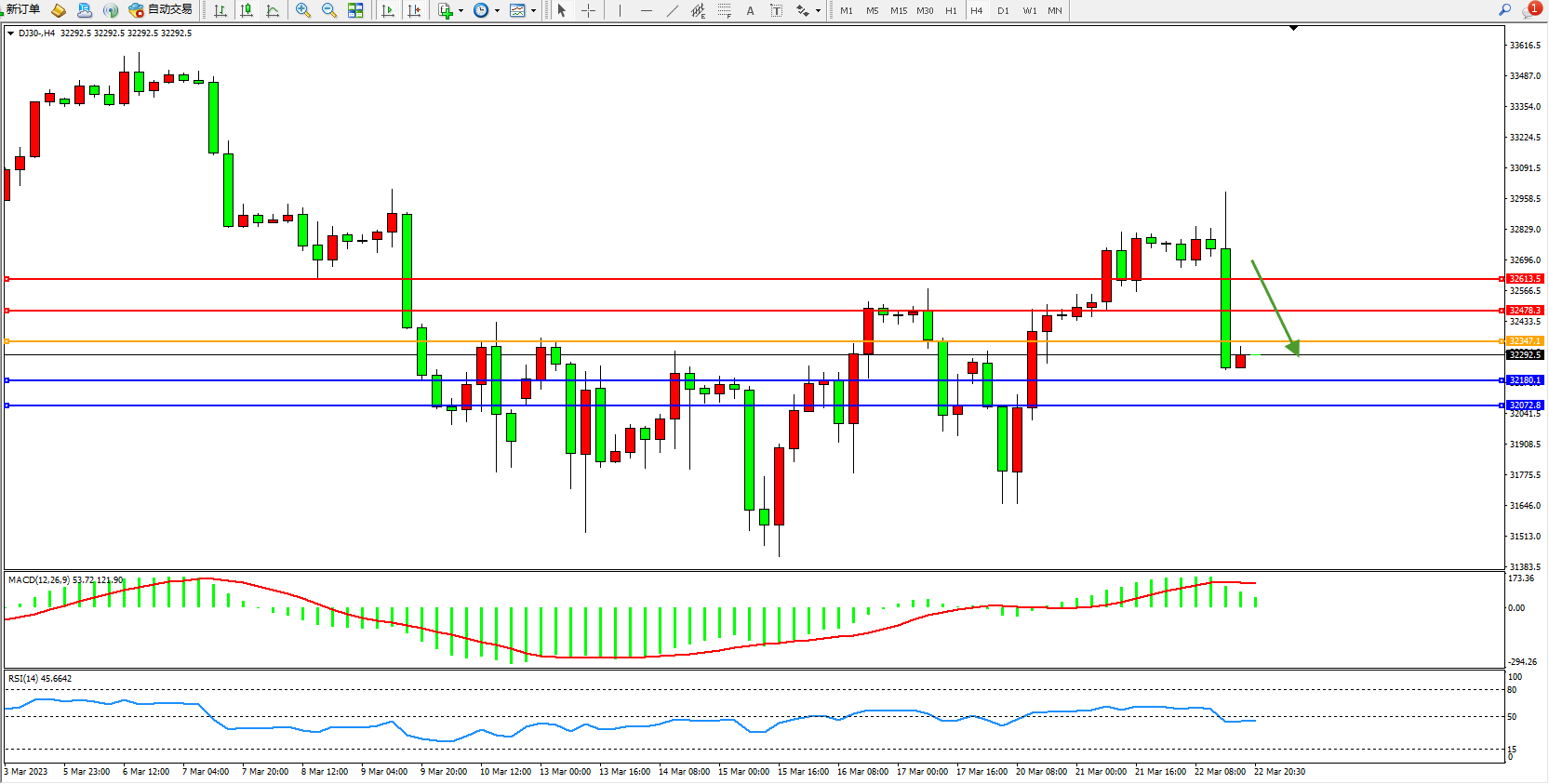 道琼斯指数DJ30——4小时K线图显示: