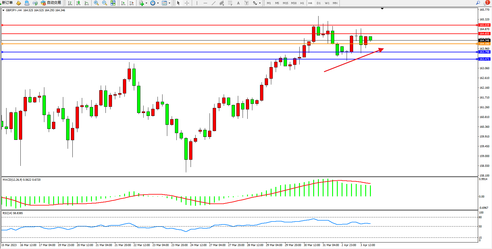 4小时图看:高位短期维持整理,市场多头情绪不断攀升后开始减弱平移,MACD指标处于多头区域徘徊,RSI指标处于50均衡线上側弱势整理;