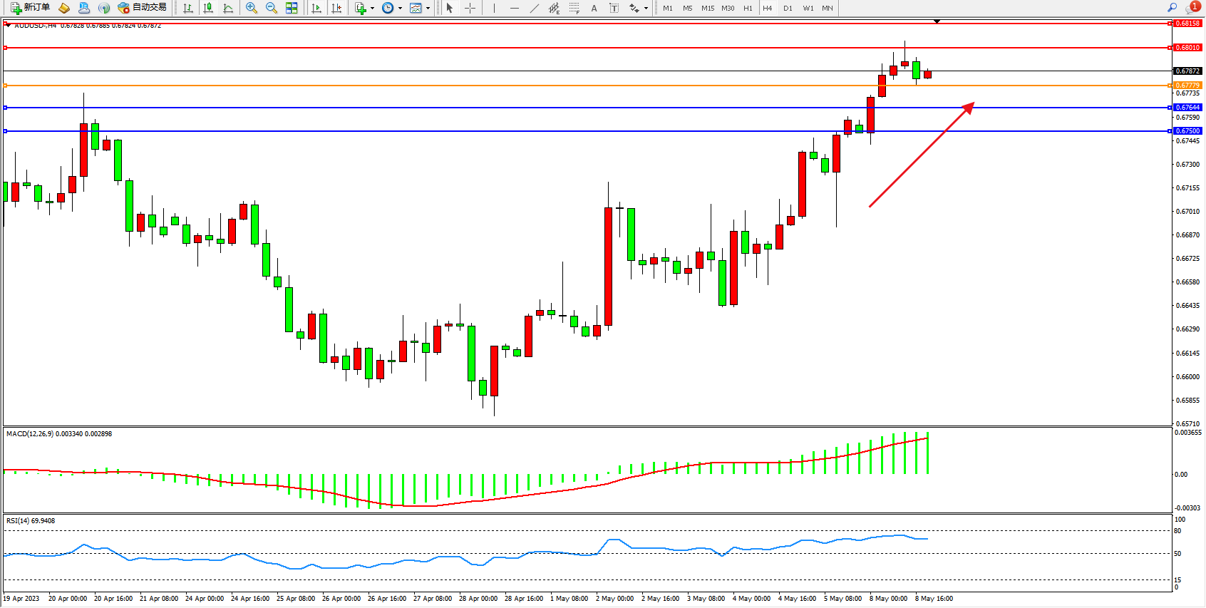 交易策略:0.67779上方看涨,目标0.68010  0.68158