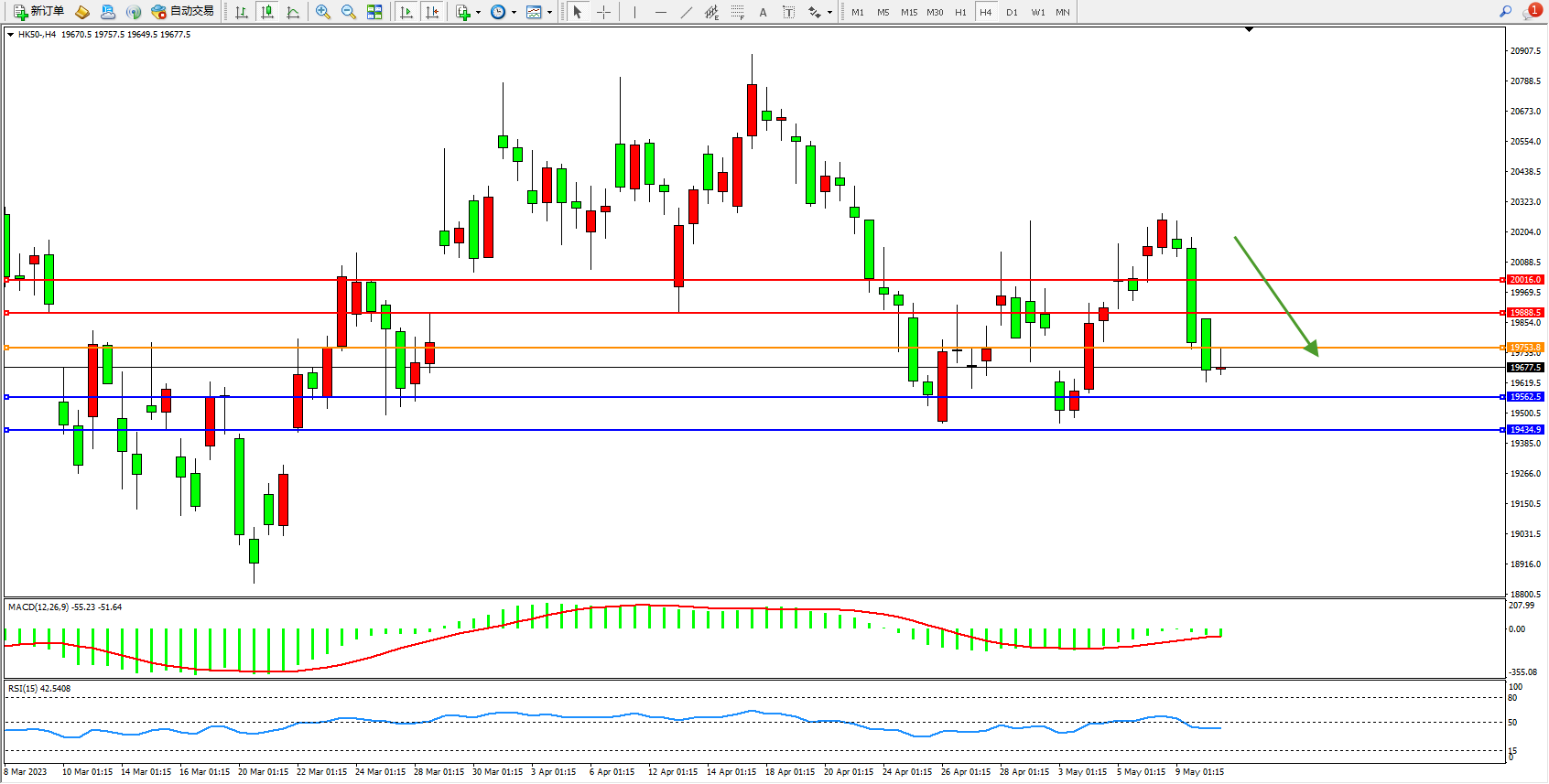 香港恒生指数5月10日(周三)收盘下跌105.38点,跌幅0.53%,报19762.2点;港股三大指数走势分化,由于大金融股、中特估概念股熄火,拖累恒指、国指分别下跌0.53%和0.77%,恒生科技指数涨0.34%表现较强。型科技股涨跌不一,快手涨约2%,网易、阿里巴巴涨约1%,美国经济下滑将于本季出现,较之前预期的更早。多种因素包括零售销售下降、美国地区性银行的动荡,促使他加快对经济衰退的预测,南下资金全日净流入14.9亿港元,大市成交额缩量至不足千亿港元。