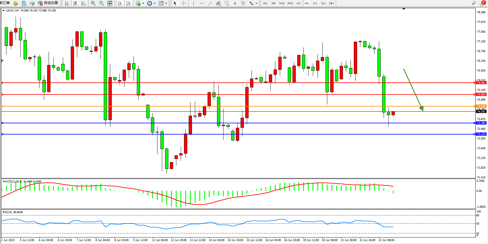 交易策略:74.408下方看跌,目标73.700 73.229