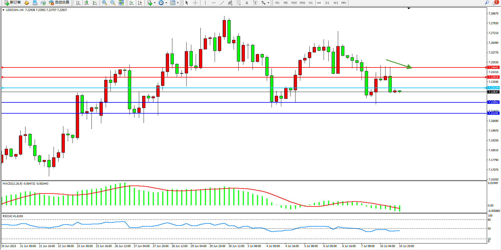 备选策略:7.23129上方看涨,目标7.23919 7.24642