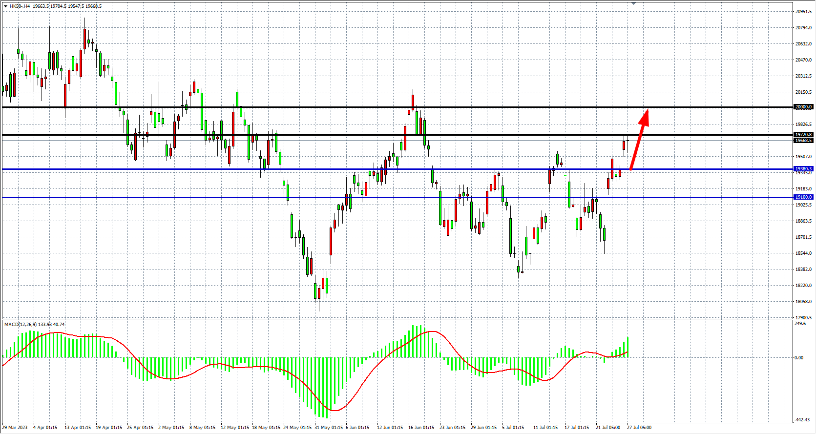 4小时图看,恒指在进一步上攻19700一线,MACD量能在零轴上继续放大,支撑上移19380,上方目标看20000点附近。