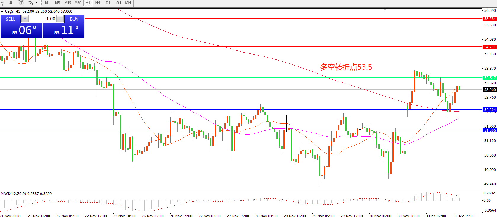 交易策略:在53.5之上看涨,目标54.70   55.80