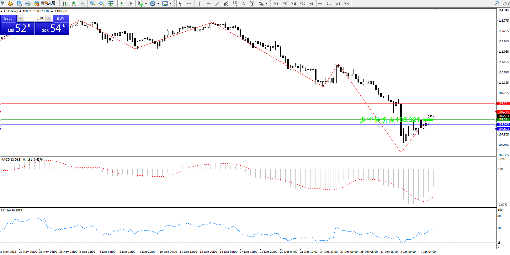 交易策略:108.321上方看涨,目标108.735、109.201