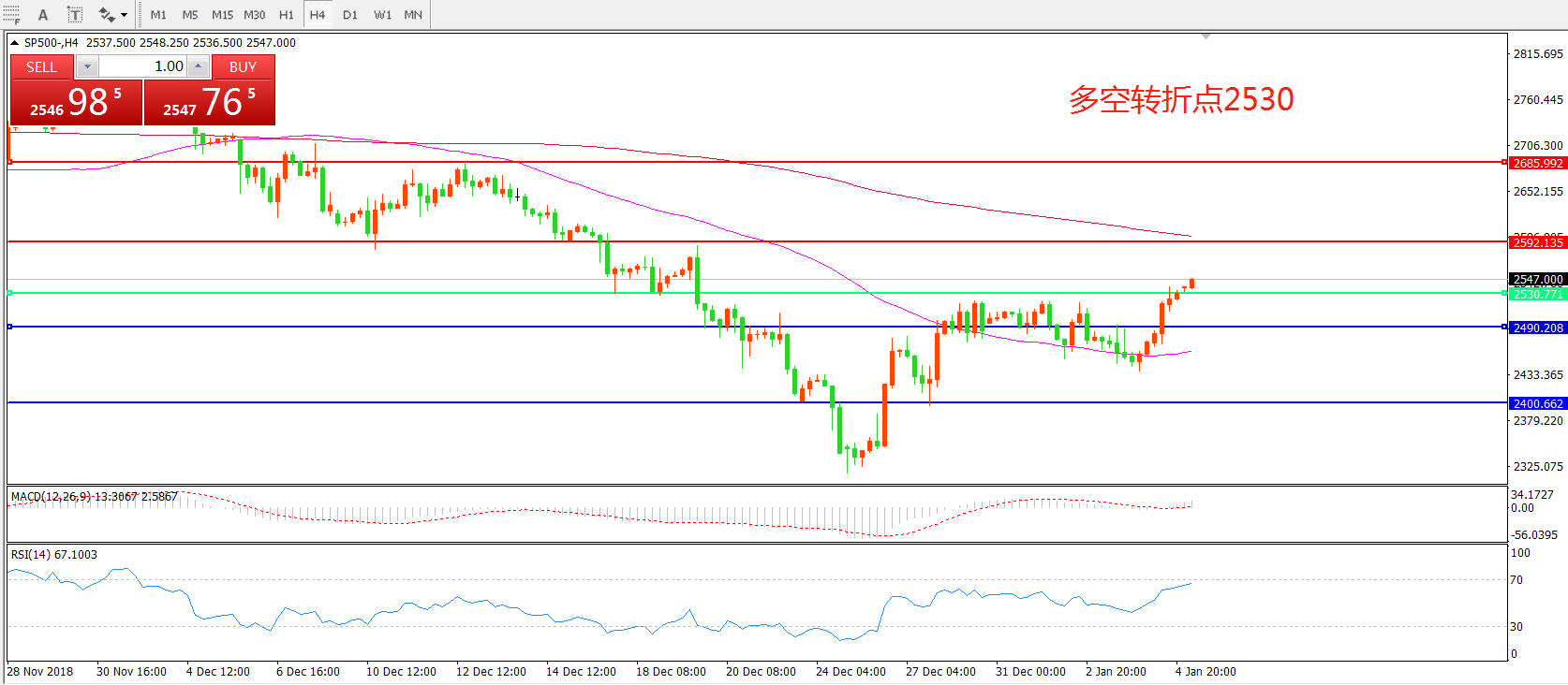 4小时图看,SP500站2490后强势上行,均线系统有拐头迹象,MACD红柱增加,RSI指标出现拐头,短期反弹概率较大。