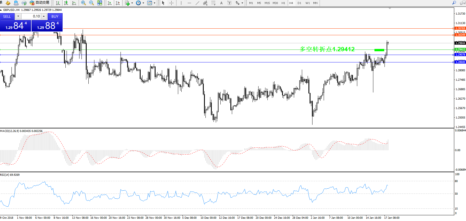 交易策略:1.29412上方看涨,目标1.30349、1.30769