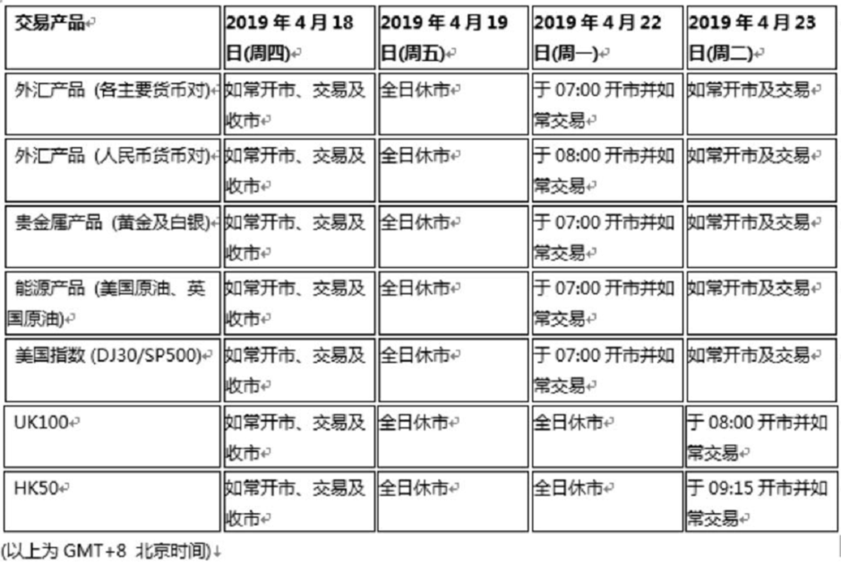 由于2019年4月19日(周五)为欧美市场耶稣受难日假期,2019年4月22日(周一)为亚欧市场复活节假期;以下市场交易产品的交易时间将于假期期间休市,敬请留意知悉!