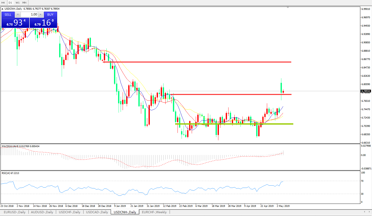 交易策略: 在6.6990之上,看涨,目标价位为6.7845,然后为6.8200。