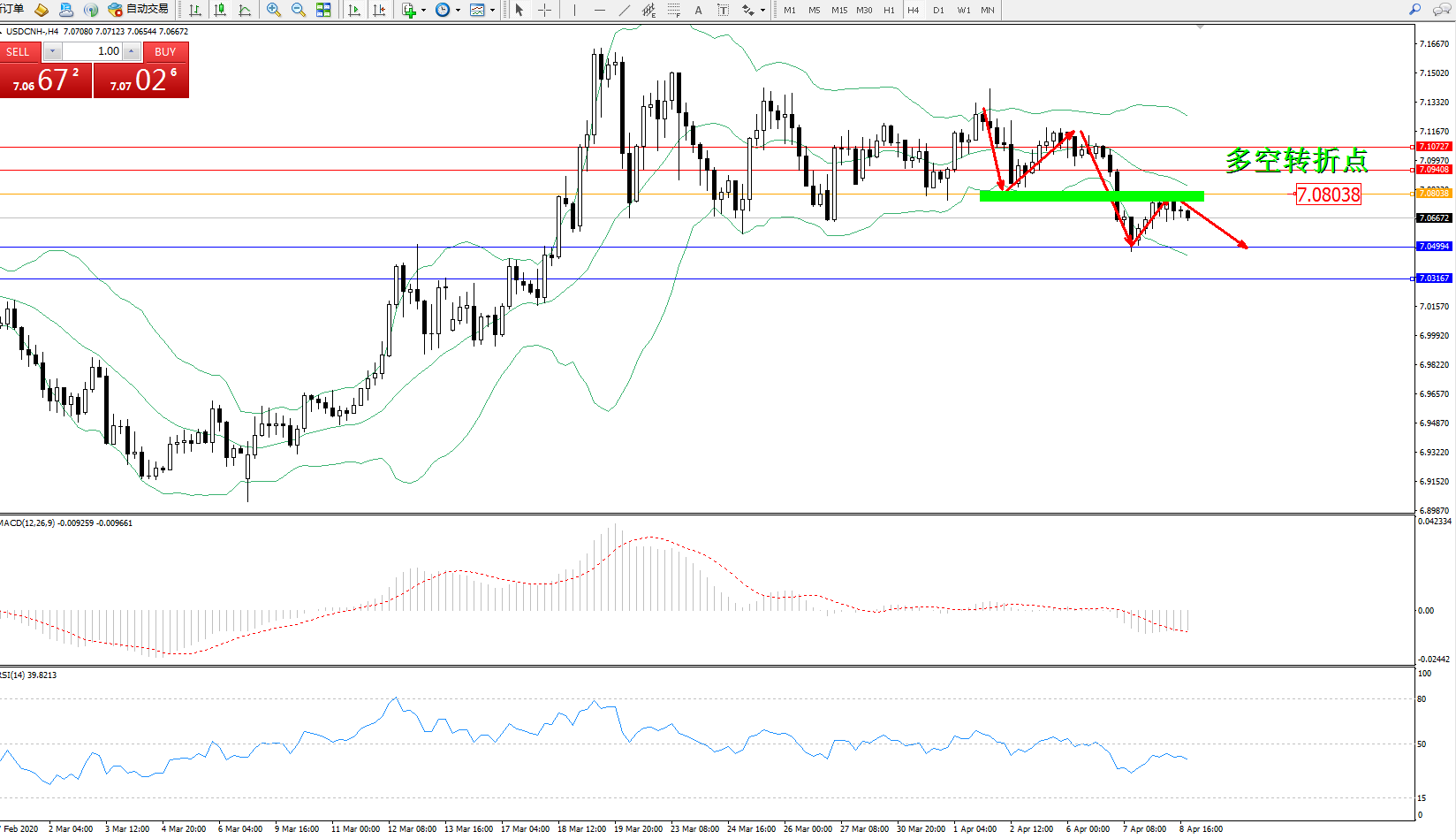 交易策略:7.08038下方看跌,目标7.04994、7.03167