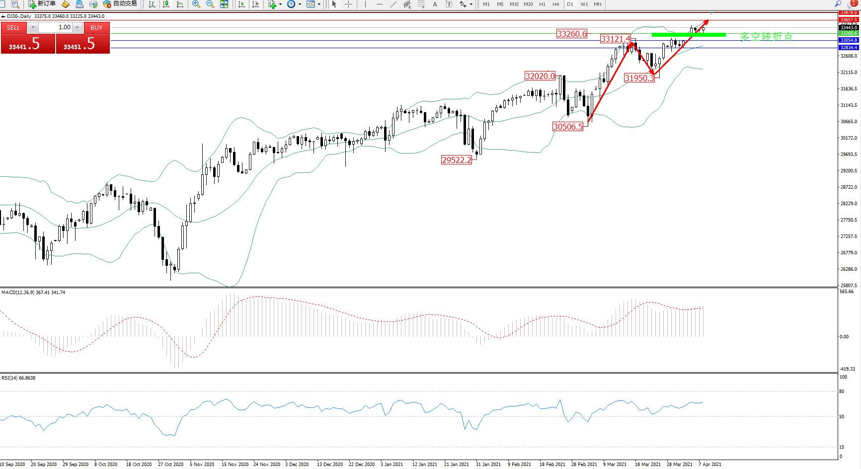 交易策略:33260上方看涨,目标33657、33878