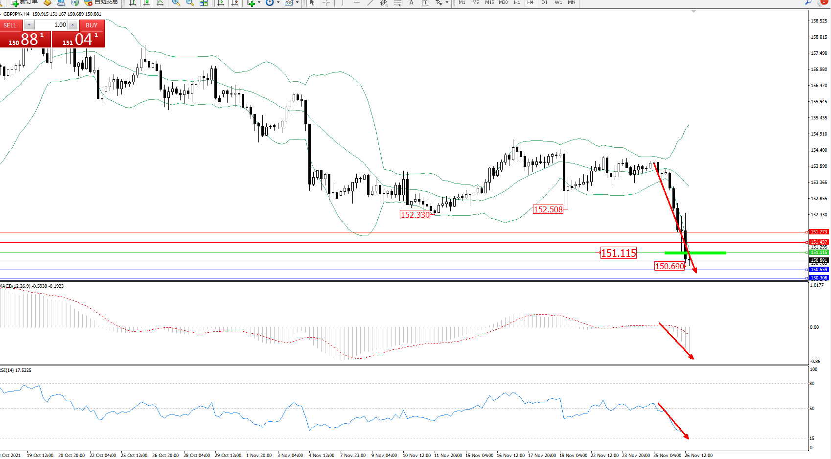 交易策略:151.115下方看跌,目标150.559、150.308