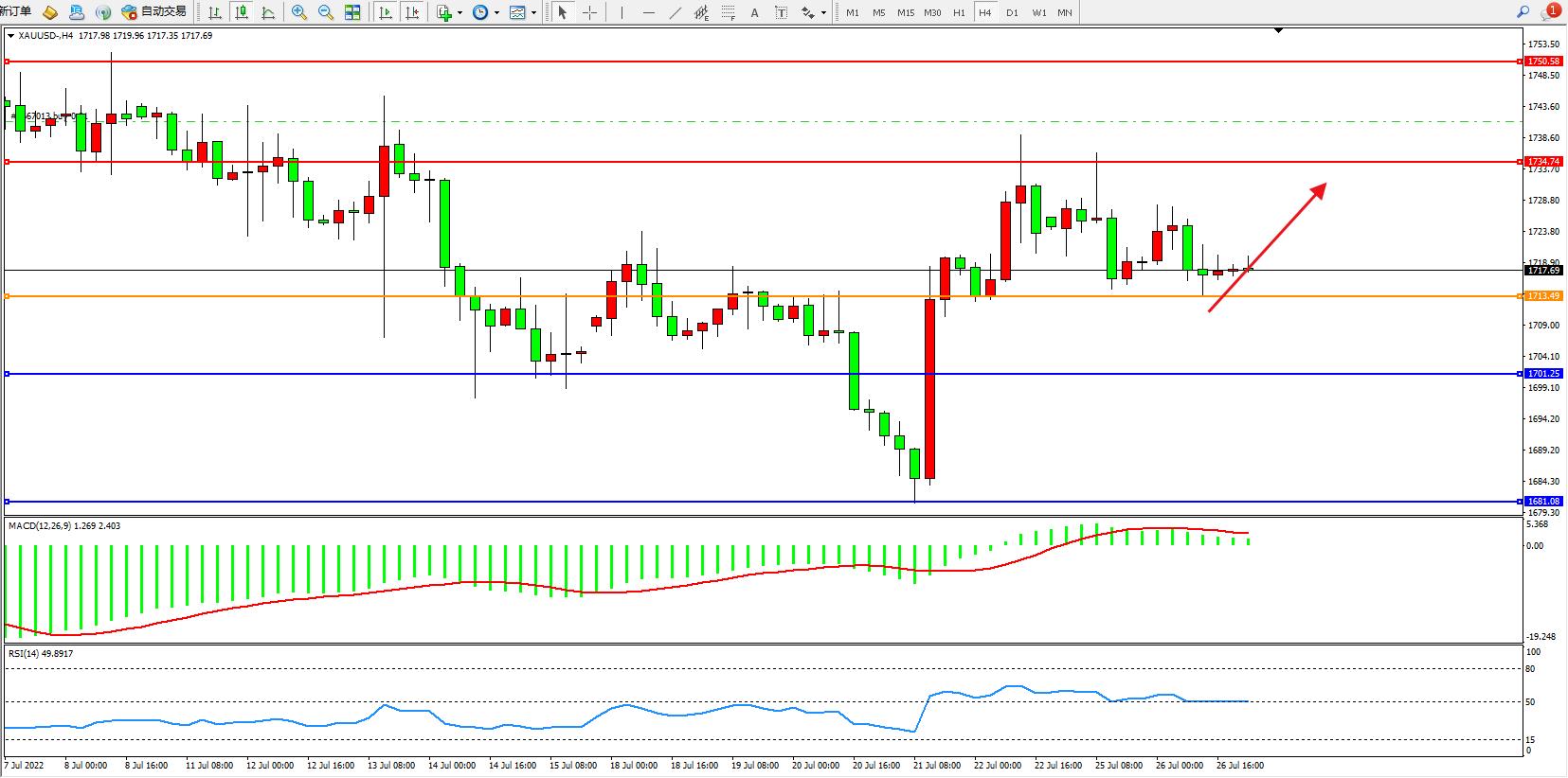 交易策略:在1713.00之下看跌,目标1700.00          1680.00