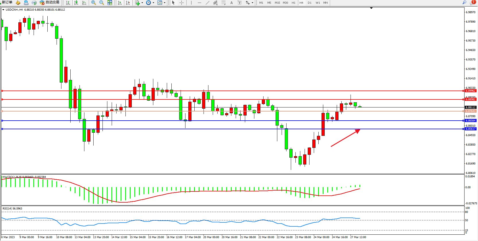交易策略:6.87643上方看涨,目标6.88982  6.89962
