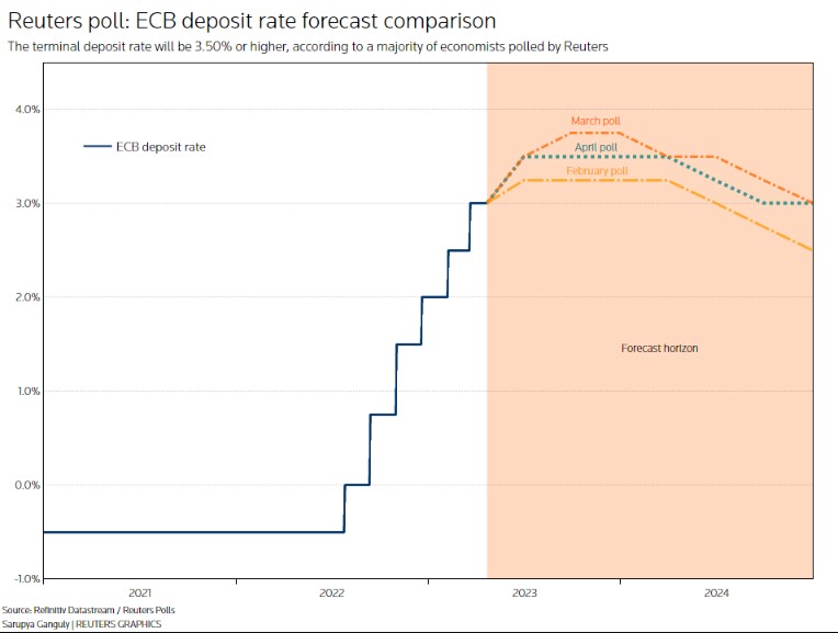 根据一项最新调查显示,经济学家普遍预计,欧洲央行几乎肯定会在5月4日将存款利率上调25个基点,然后在6月将存款利率上调至3.50%或更高,因为核心通胀率仍然居高不下。