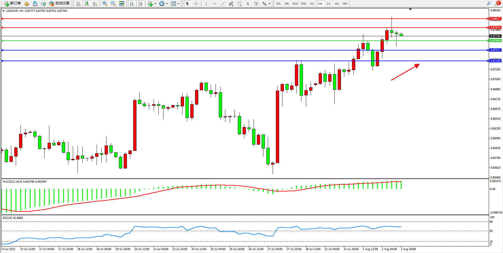 美元瑞郎USDCHF——4小时K线图显示: