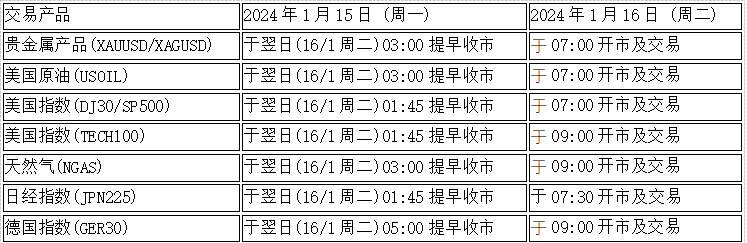 因应美国马丁路德金纪念日假期2024年1月15日(周一), 本公司以下产品的交易时间将于假期期间作以下安排,敬请留意。