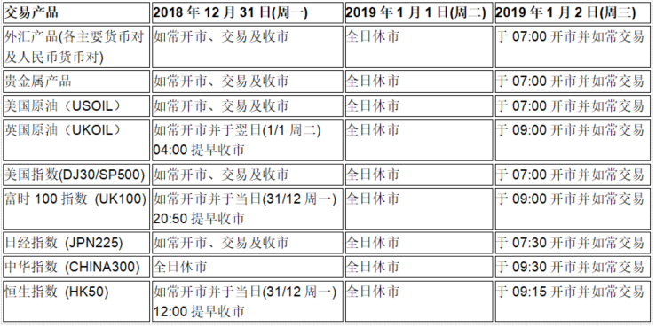 2. 贵金属产品、美国原油将于休市后至下一个交易日开市前(1月1日06:00至1月2日07:00) 自动取消所有挂单。